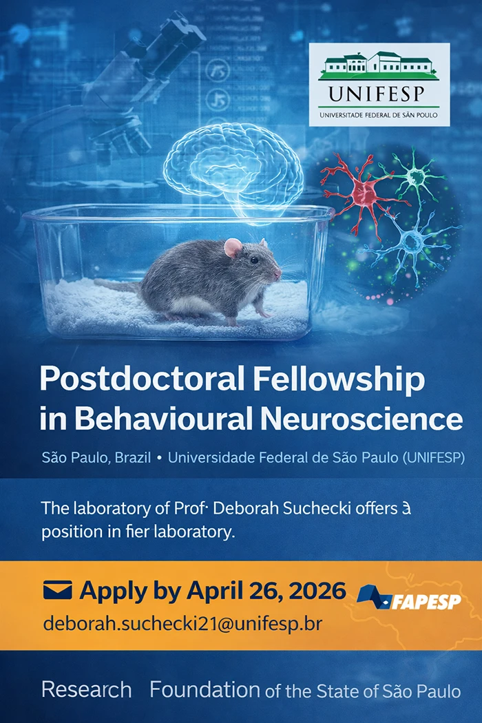 The laboratory of Prof. Deborah Suchecki, at the Department of Psychobiology of the Universidade Federal de São Paulo (UNIFESP), is inviting applications for a Postdoctoral position in Behavioural Neuroscience, funded through a FAPESP fellowship.